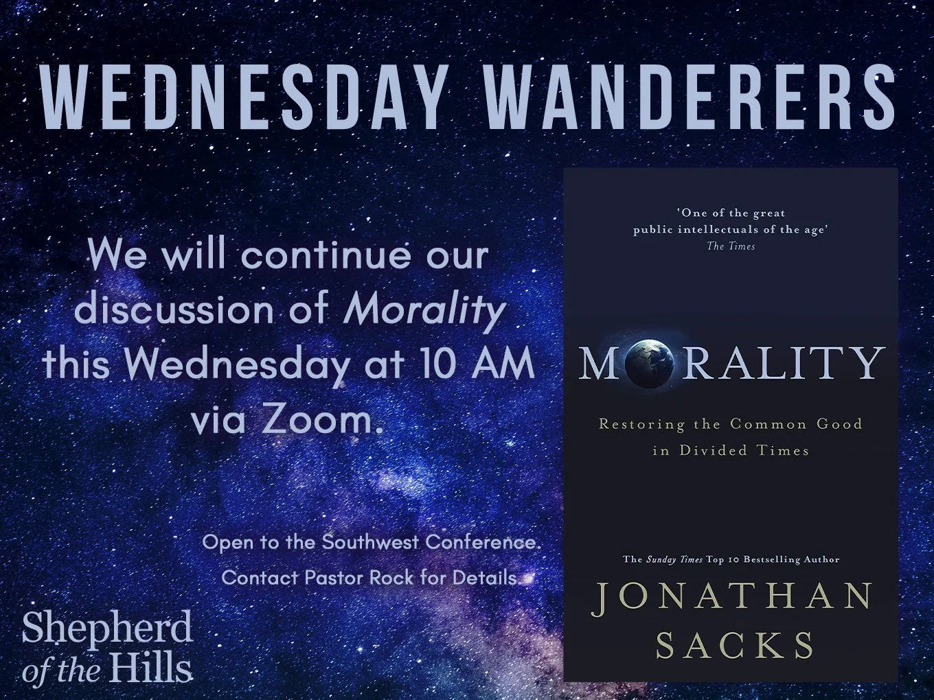 We're thrilled to invite you to embark on a thought-provoking journey with us as we dive into "Morality" by Rabbi Jonathan Sacks. This upcoming Wednesday is the perfect opportunity to join the Wednesday Wanderer book group and delve into the profound ideas and insights within the pages of this remarkable book. Rabbi Sacks' exploration of morality is timely, offering a fresh perspective on some of our age's most pressing ethical questions.
